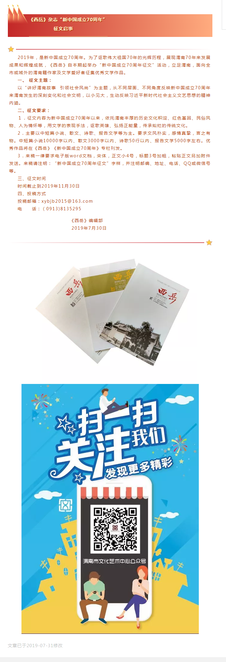 《西岳》杂志“新中国成立70周年”征文启事