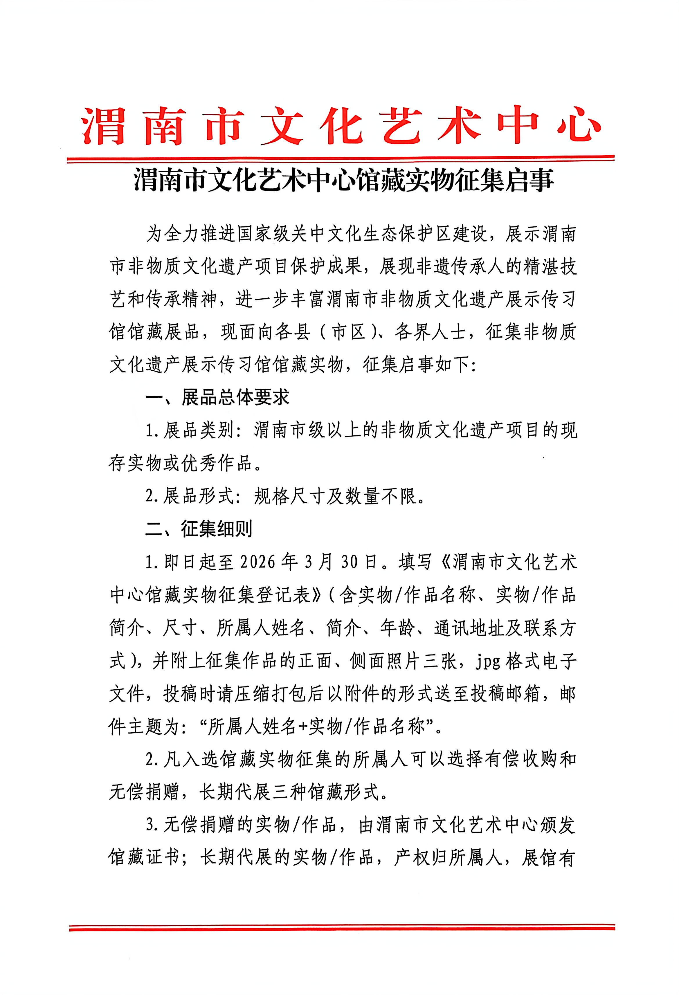 渭南市文化艺术中心馆藏实物征集启事