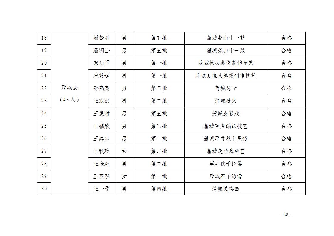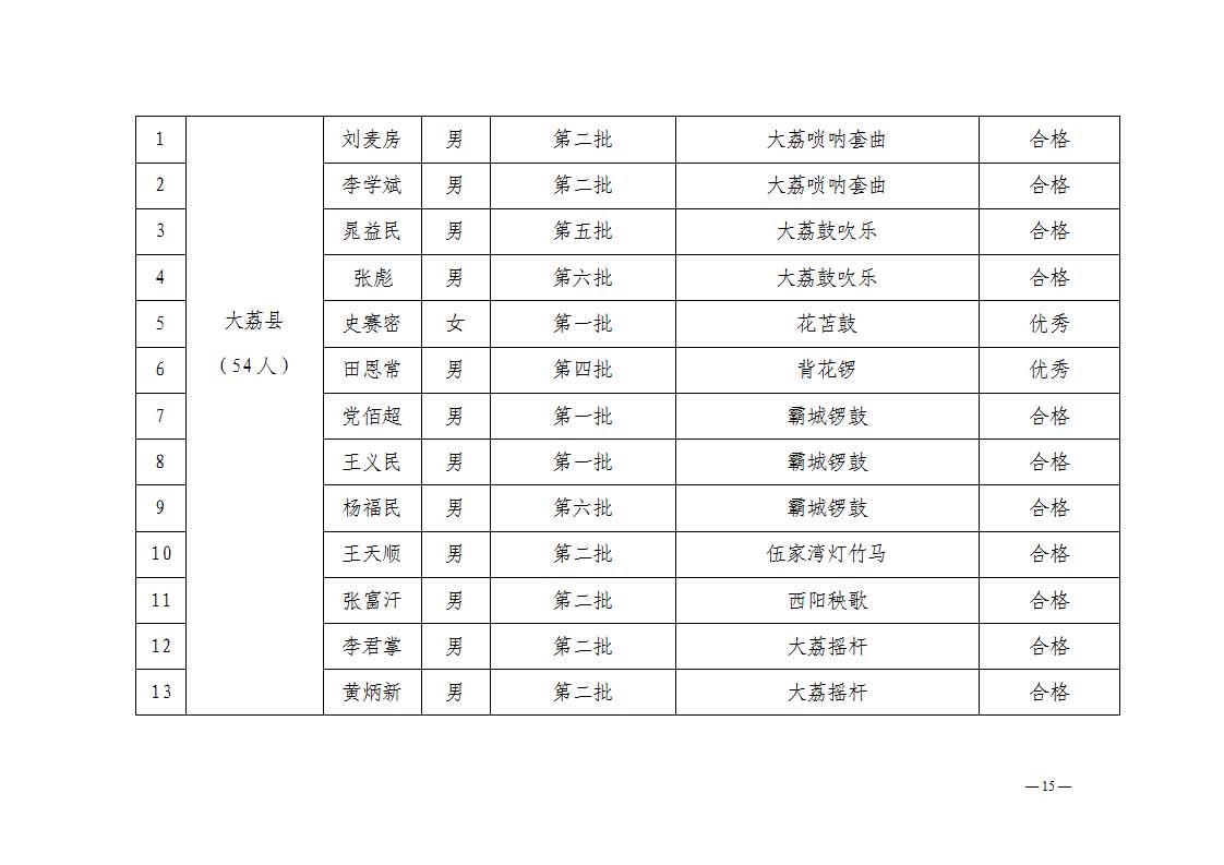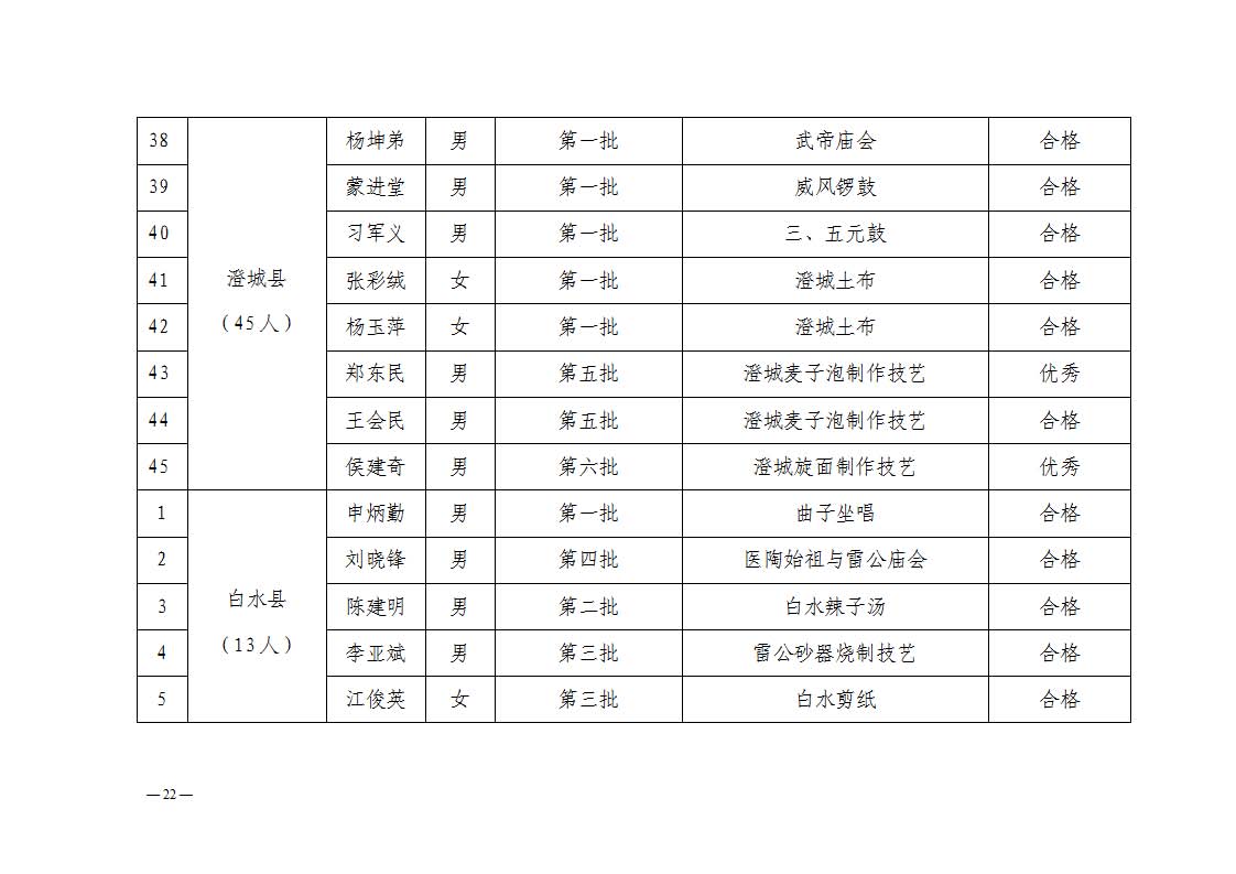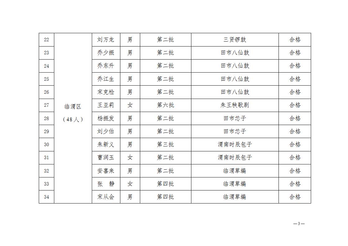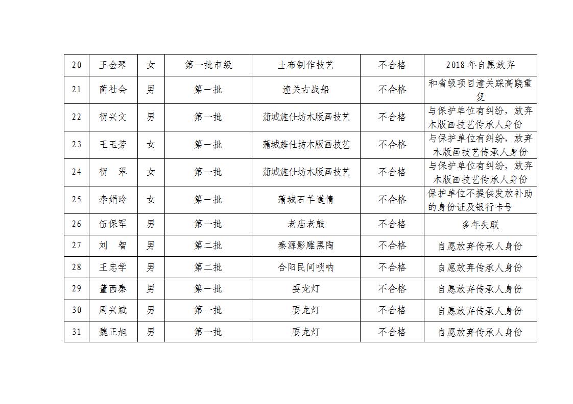 2. 依据《中华人民共和国非物质文化遗产法》《陕西省非物质文化遗产条例》及《渭南市市级传承人认定与管理办法》第十四条规定,拟对考核不合格的34名传承人暂停发放传习补助费用。