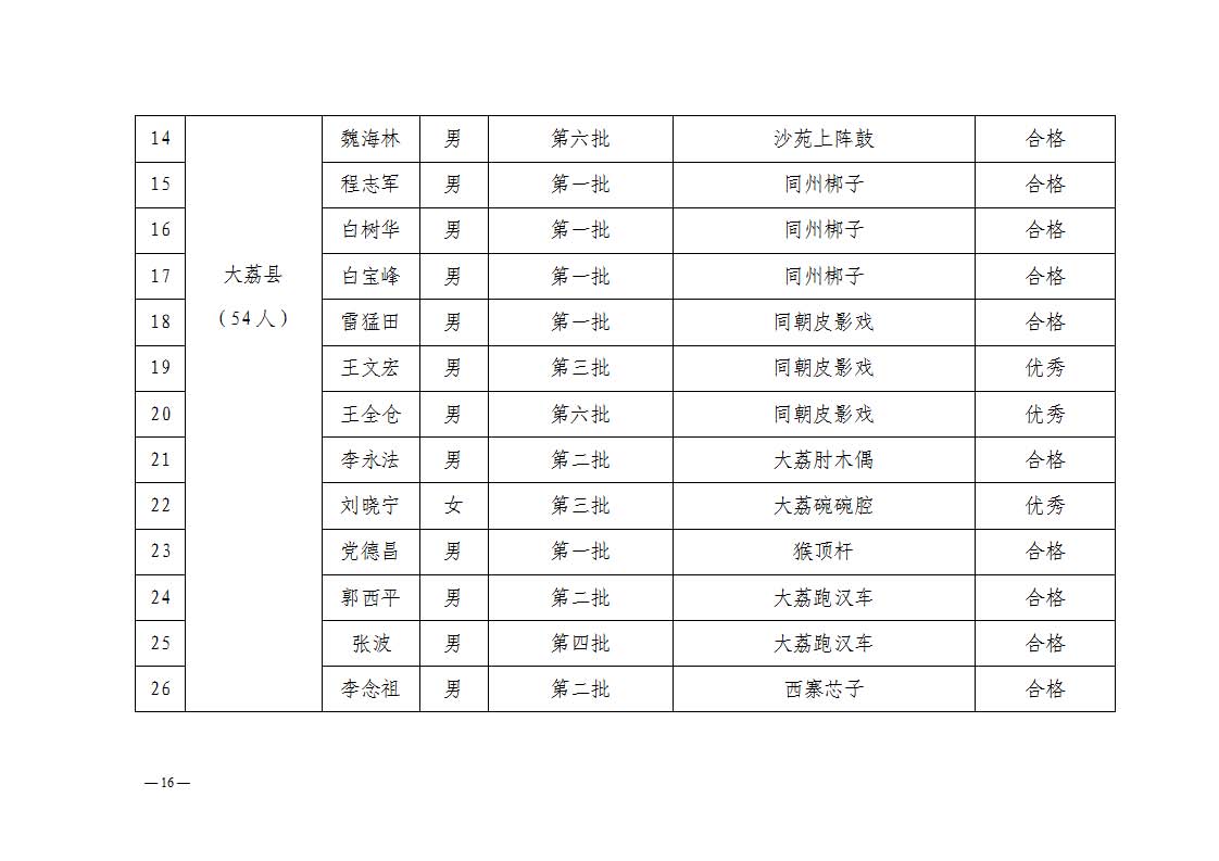 根据《关于开展2025年市级非物质文化遗产项目代表性传承人年度考核的通知》(渭文中心发[44]号)要求,渭南市文化艺术中心于2025年9月启动市级传承人年度考核工作,经资料审核、会议研究,已于11月完成全部考核流程,现将结果公示如下: