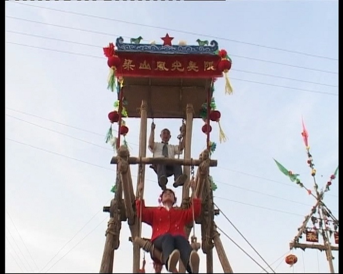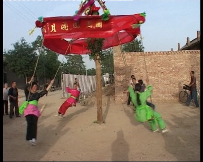 南社秋千分布于合阳县黑池镇南社村及其周边地区,是一种集游戏、体育于一体的娱乐健身活动,已有千余年历史。旧俗认为“立春”之后荡秋千有怯病强身的作用,民间流传“游一游,怯病愁,荡一荡,身体壮”的说法。南社秋千具有鲜明的传统农耕文化特征。一般取材于农具,木柱、木椽是农村打墙用的“夹杆”和“板”,秋千绳是勒麦车的勒绳或牛套绳,固定秋千用的大车轱辘、大车轴、碌碡、牛轭斗、辕环都是农村常见的农具或挽具,连牲口脖子上的串铃也是秋千架上的装饰点缀之物。南社秋千从绑扎形式上可以分为门式秋千、天平秋千、三状元秋千、轮儿秋千、过梁秋千等;从游戏方式上可以分为单人荡、双人荡(对面秋)、带人荡(一人坐一人立)、多人荡等。秋千造型美观,结构牢固,摆幅大,具有很强的观赏性和参与性。南社秋千对研究我国民俗史、农业史有着重要的价值。南社秋千2011年被列入第三批陕西省非物质文化遗产名录。