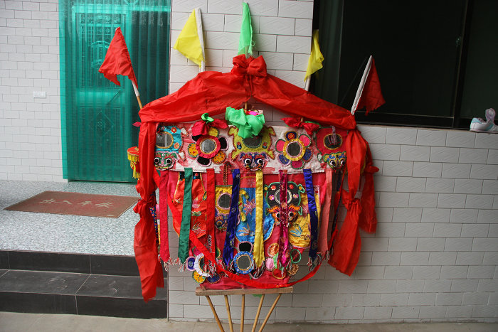 背花锣是大荔县官池镇西里村的一种特色锣鼓艺术,相传创始于元代,后来演变为当地祭祀药王孙思邈社火活动的固定节目。背花锣的特色是道具“背花”,它用五根等长的细竹绑扎成2平方米大小的扇形竹架,基部用绳索或布条固定,竹架两面装饰有十带裙、肚兜、围嘴等各色刺绣(一个背花的绣品常达20多幅),刺绣上再固定几面镜子,下方有一个小神龛,供奉药王神像。每逢农历二月初一药王庙会的前一天,村民身穿节日盛装,带好乐器道具,前往耀县求取药王山圣泉药水,取水队伍常达百余人,分为十二组,每组八人(背花者手持大锣,手锣、大镲,差伞表演者各一个,花苫鼓演奏者四个)。全体人员分三路纵队,随着锣鼓的慢流水节拍缓步前行,不断做出倒步、转身、闪动背花等动作,仿佛在侧身遮蔽保护锣手背后的接水楼。背花锣融汇刺绣技艺、锣鼓音乐、传统舞蹈、药王祭祀、求雨祈福等民俗活动为一体,具有深厚的文化底蕴。背花锣2013年被列入第四批陕西省非物质文化遗产名录。