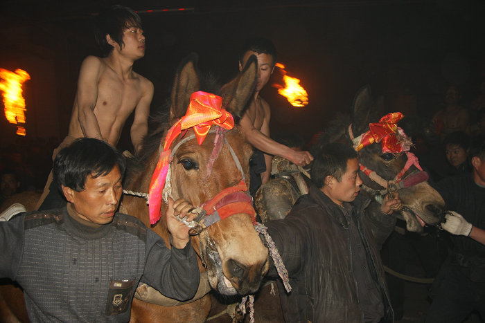 大荔县西寨乡马坊村地处黄、洛、渭三河交汇的沙苑深处,为秦汉时兵家争衡之地。当地人模仿汉代战争的战车娱乐来调剂生活,形成了跑汉车的习俗。跑汉车一般在每年正月十五期间举行。一辆汉车需要15-19人,其中4人驾辕(控制方向),2人护辕(协助驾辕),2人拉梢(控制进退),2人开路,1人拦头,1人表演,车上载锣鼓队,由六、七人组成,车队后有一个拾路(意为打扫战场人员)。表演时,五匹骡子拉车,4人驾辕以百米速度飞奔,表演者在骡子身上变换身姿,腾挪跳跃于各个骡子之间,令人叹为观止。与此同时,护辕2人挥鞭猛抽骡子,以加快速度,护梢的两个人负责牵拉,保证安全。俨然一支配合默契、训练有素的战斗小分队。跑汉车保留了古代战争指挥车的形式,为研究古代战车有参考作用。大荔跑汉车2010年被列入第二批渭南市非物质文化遗产名录。
