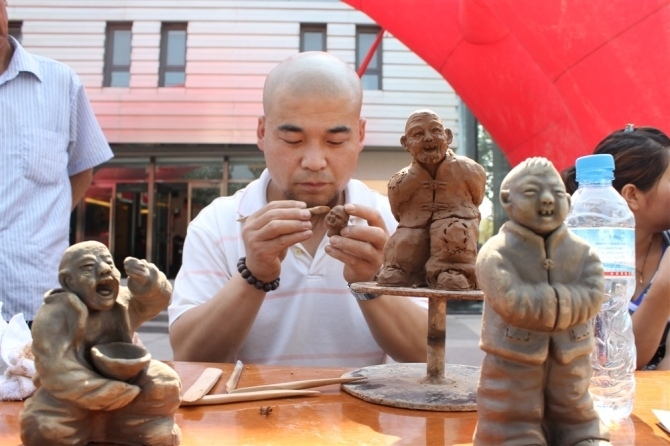 上徐泥塑技艺是白水县上徐村郭姓家传的独得之秘,它采用当地的红粘土和白粘土为主要原料,经过炼工、翻坯、烧制等二十多道工序制作而成。制作时,先将胶土与水和成糊状,经过窖淋渗干多余的水分,把泥挖出来放在平板上,加适量麻纸或棉花,用木棒反复捶打,直到混合均匀。之后经过一番用力摔打,用塑料纸密封三天,便可捏制。泥塑制作全凭艺人的手上功夫,借助竹签、铁条、小刀、细锯等,通过点、按、挑、刻、画的手法和泥点、泥线的堆积,塑造作品。上徐泥塑的代表作品有《陕西八大怪》、《白水四圣》、《关中风情》、《爷孙钓鱼》、《农家情》、《男童上树》等,造型诙谐有趣,色彩简洁明快,地域色彩鲜明,朴拙奔放,深受人们喜爱。上徐泥塑2010年被列入第二批渭南市非物质文化遗产名录。
