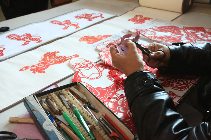 富平剪纸以老庙镇笃祜村的最为有名,相传源于皮影,从汉代传承至今。现在仍广泛用于岁时节日的窗花、门鉴、灯花、礼仪花以及刺绣的花样等。富平剪纸种类丰富、造型多样,主要取材于人物、花卉、动物、乡土风情等,给人以朴实亲切的感觉。艺人在代代相传的过程中摸索出单手剪纸、点染剪纸、彩色剪纸、彩纸套贴、对称剪纸、串联拉花、多折团花、单幅创作等方法来剪刻作品,还创造了描红法、熏染法、针刺法、复写法、剪样拓剪法等方法来复制花样。常用工具包括剪刀、斜刀、槽口刀、圆口刀等以及垫板、锥针、浆糊等辅助工具。富平剪纸曾多次参加各级美术公益展,许多作品被港澳台同胞和外国友人精心收藏。富平剪纸2010年被列入第二批渭南市非物质文化遗产名录。