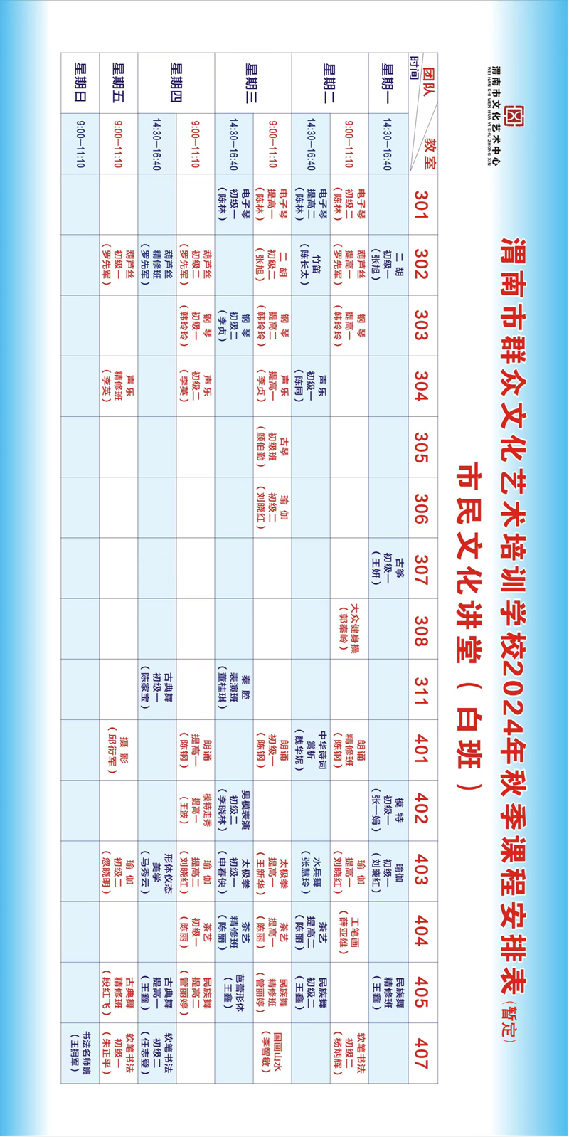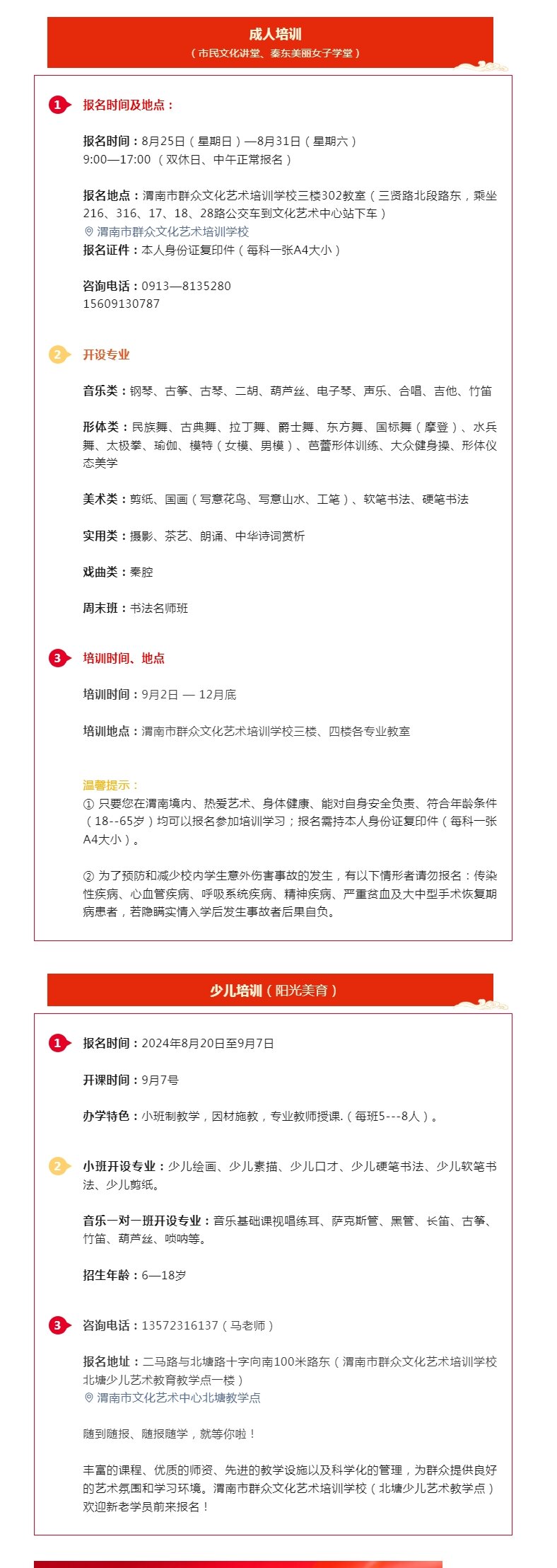 渭南市群众文化艺术培训学校2024年度秋季培训招生即将于8月25日启动!热爱艺术的广大市民朋友们请快来看看有没有自己心仪的课程吧!