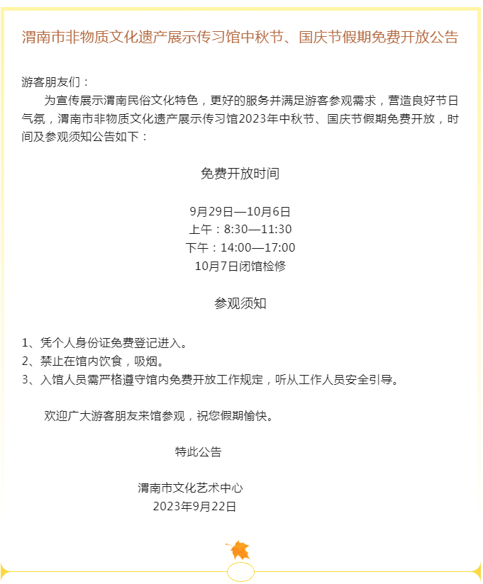 渭南市非物质文化遗产展示传习馆中秋节、国庆节假期免费开放公告