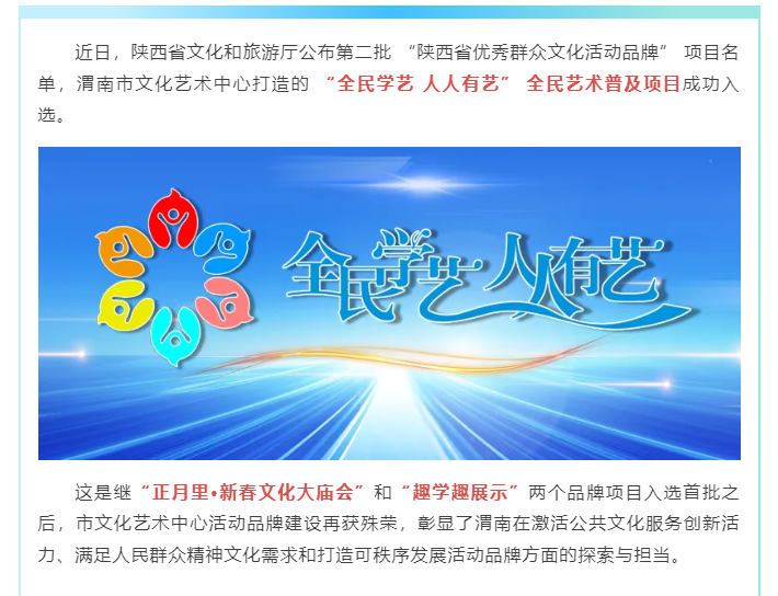 【喜报】“全民学艺 人人有艺”全民艺术普及活动入选“陕西省优秀群众文化活动品牌”
