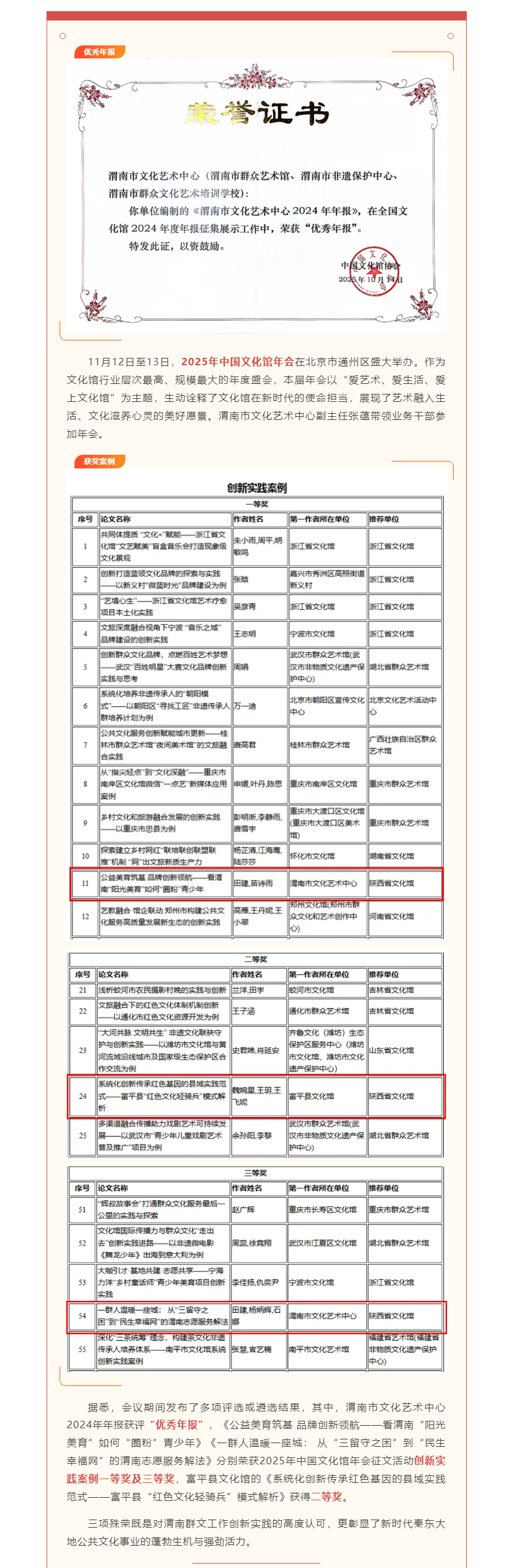 【喜报】“年报创优 + 案例夺魁” 2025年中国文化馆年会渭南获多项殊荣