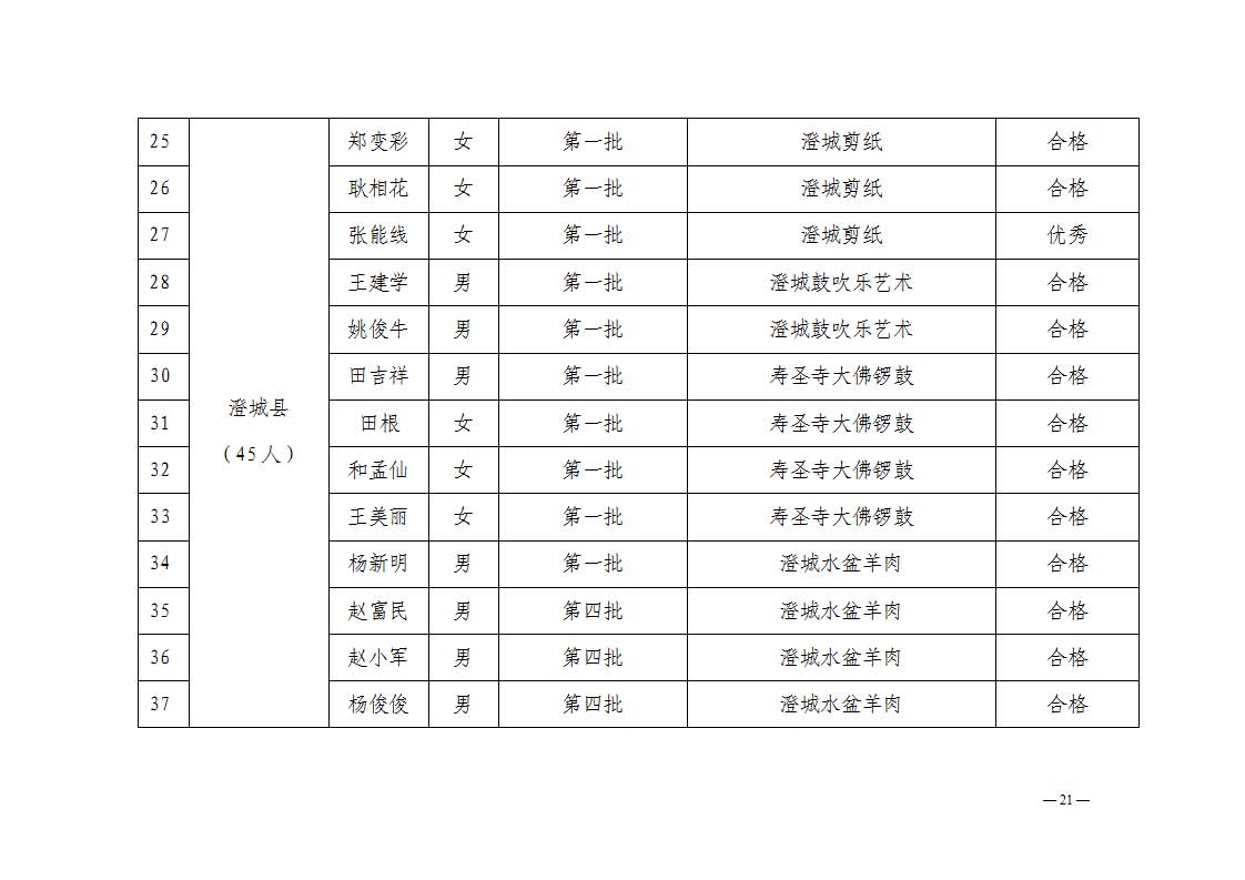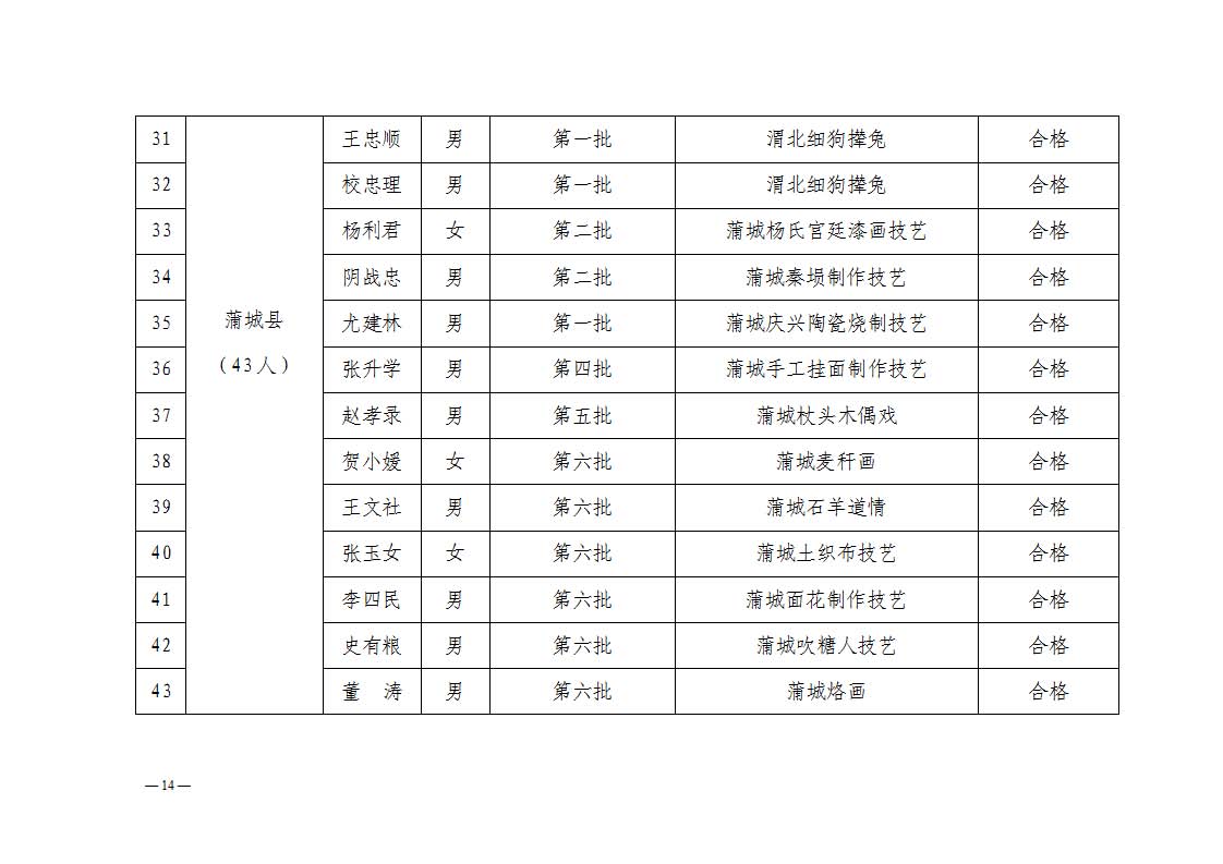 2. 依据《中华人民共和国非物质文化遗产法》《陕西省非物质文化遗产条例》及《渭南市市级传承人认定与管理办法》第十四条规定,拟对考核不合格的34名传承人暂停发放传习补助费用。