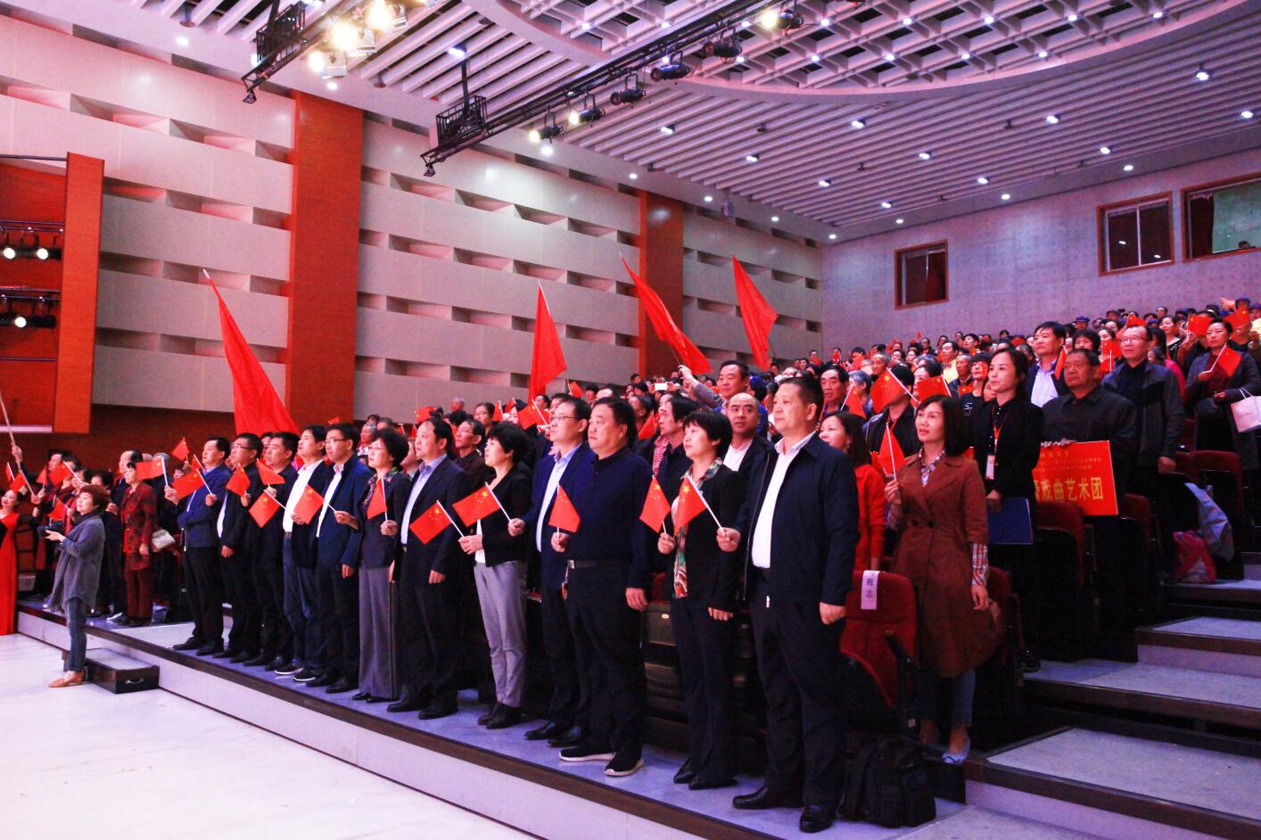 9月17日上午,渭南市庆祝新中国成立70周年群众文化活动展演季开幕式暨“我和我的祖国”2019陕西省群众文化节渭南分会场合唱展演活动在渭南市文化艺术中心举行。渭南市委常委、市委宣传部部长王玉娥,市文化和旅游局主要领导刘忠生、常伟等领导班子成员,市妇女联合会主席张红丽,市文学艺术界联合会主席骆苏弟、市委宣传部副部长兰勇及渭南市博物馆、渭南师范学院、渭南职业技术学院、渭南市文化艺术中心理事会等单位负责人和嘉宾,以及各界群众1000余人参加了演出季开幕式和合唱展演活动。